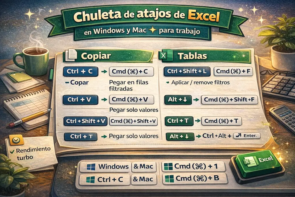 - Filtros: Windows Ctrl + Shift + L · Mac ⌘ + Shift + F.