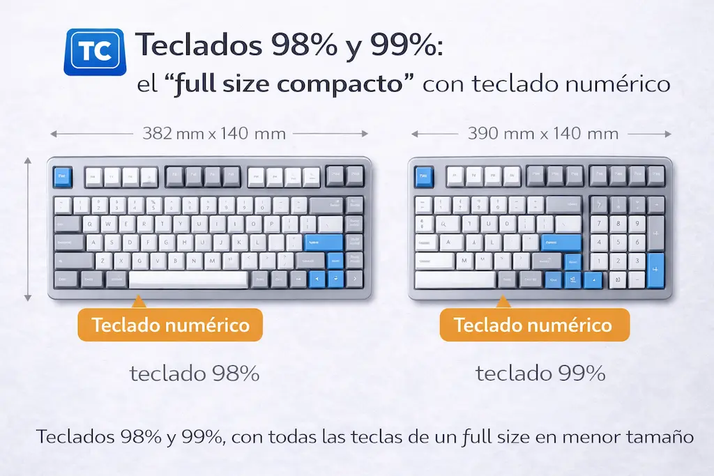 Un teclado 98% o 99% es, para muchos, el punto perfecto: teclado numérico + tamaño compacto. Si trabajas con números y quieres un escritorio más cómodo (sin renunciar a teclas), es de las mejores compras “sin drama”.